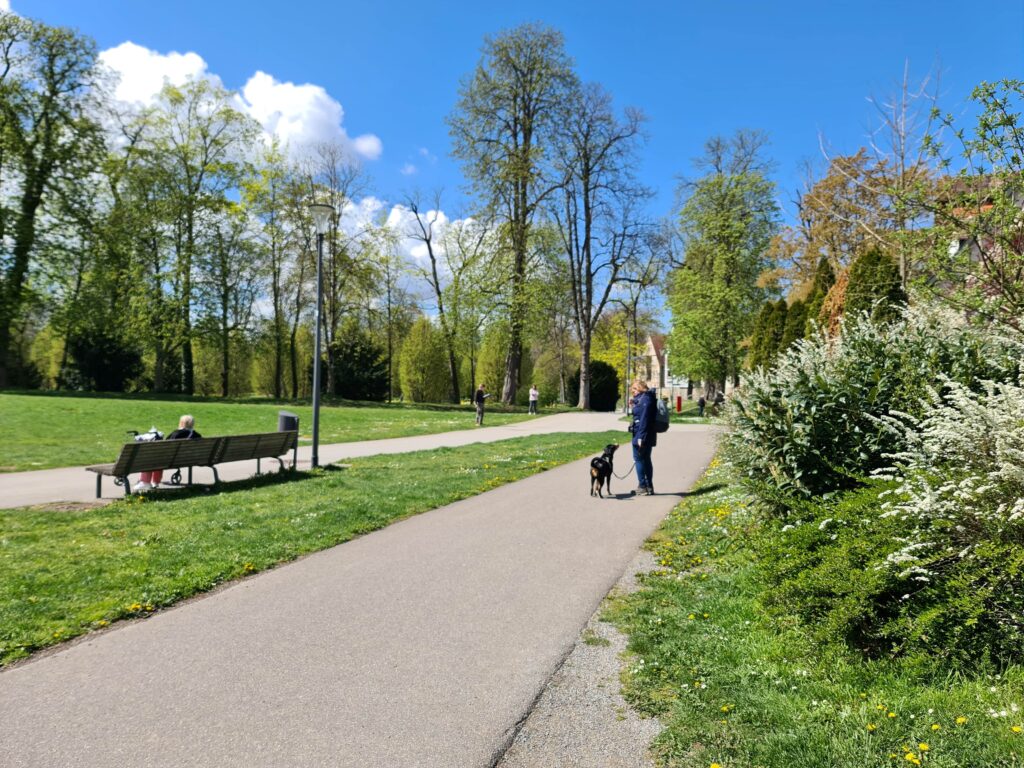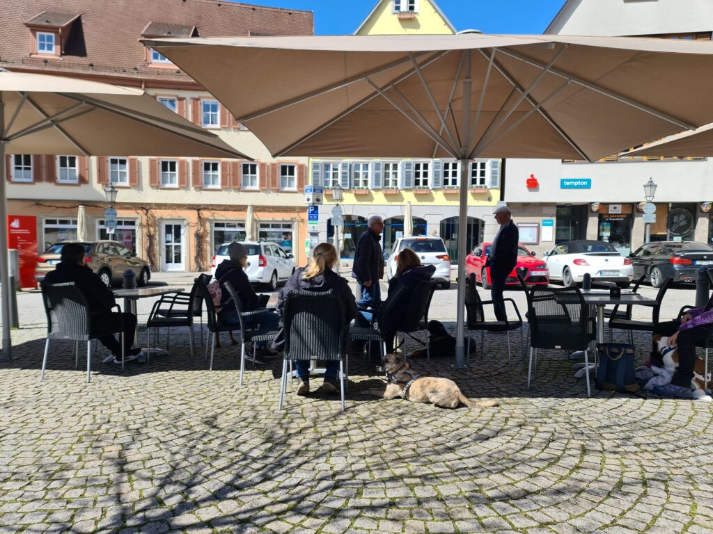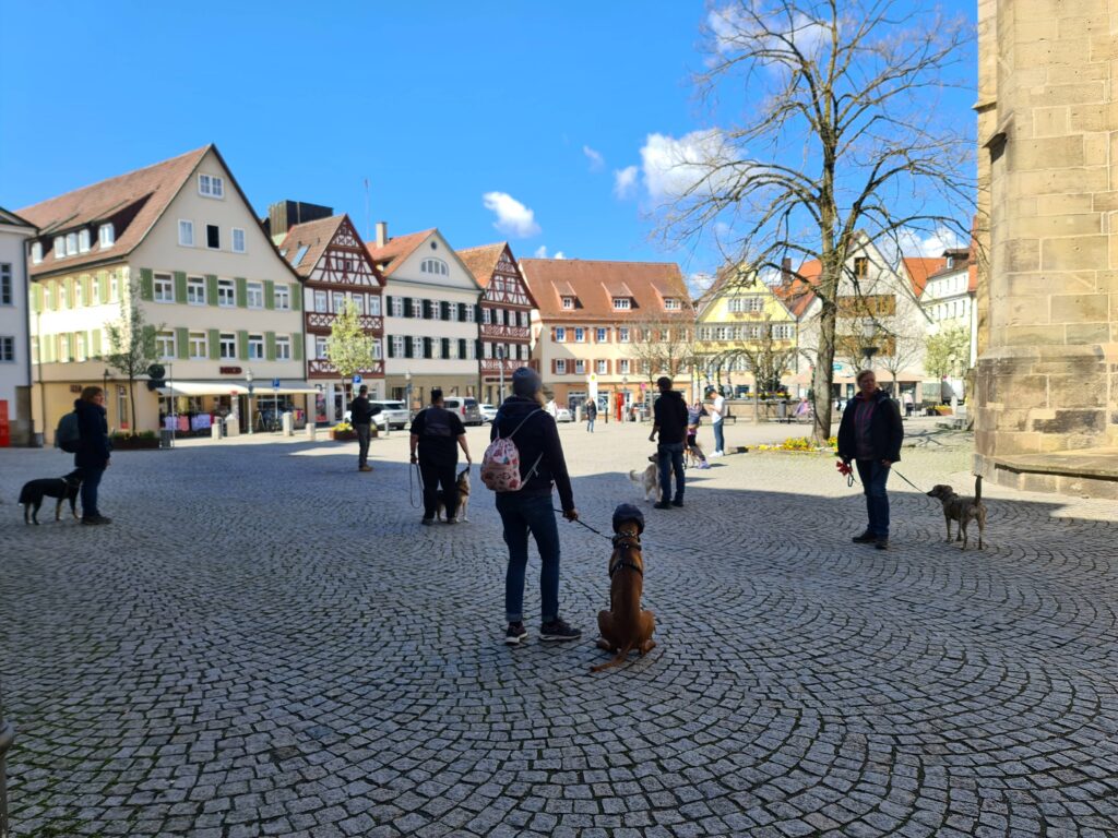 Die Prüfung ist ein sehr anstrengender Tag für alle Beteiligten, inkl. Theorieprüfung, den Einzelprüfungen auf dem Trainingsgelände, außerhalb des Geländes, im Hofgarten, in der Stadt (inkl. Café und Buchladen), Verhalten im Straßenverkehr zieht sich diese Prüfung ca. 5 Stunden – alle Teams haben das megatoll gemeistert!